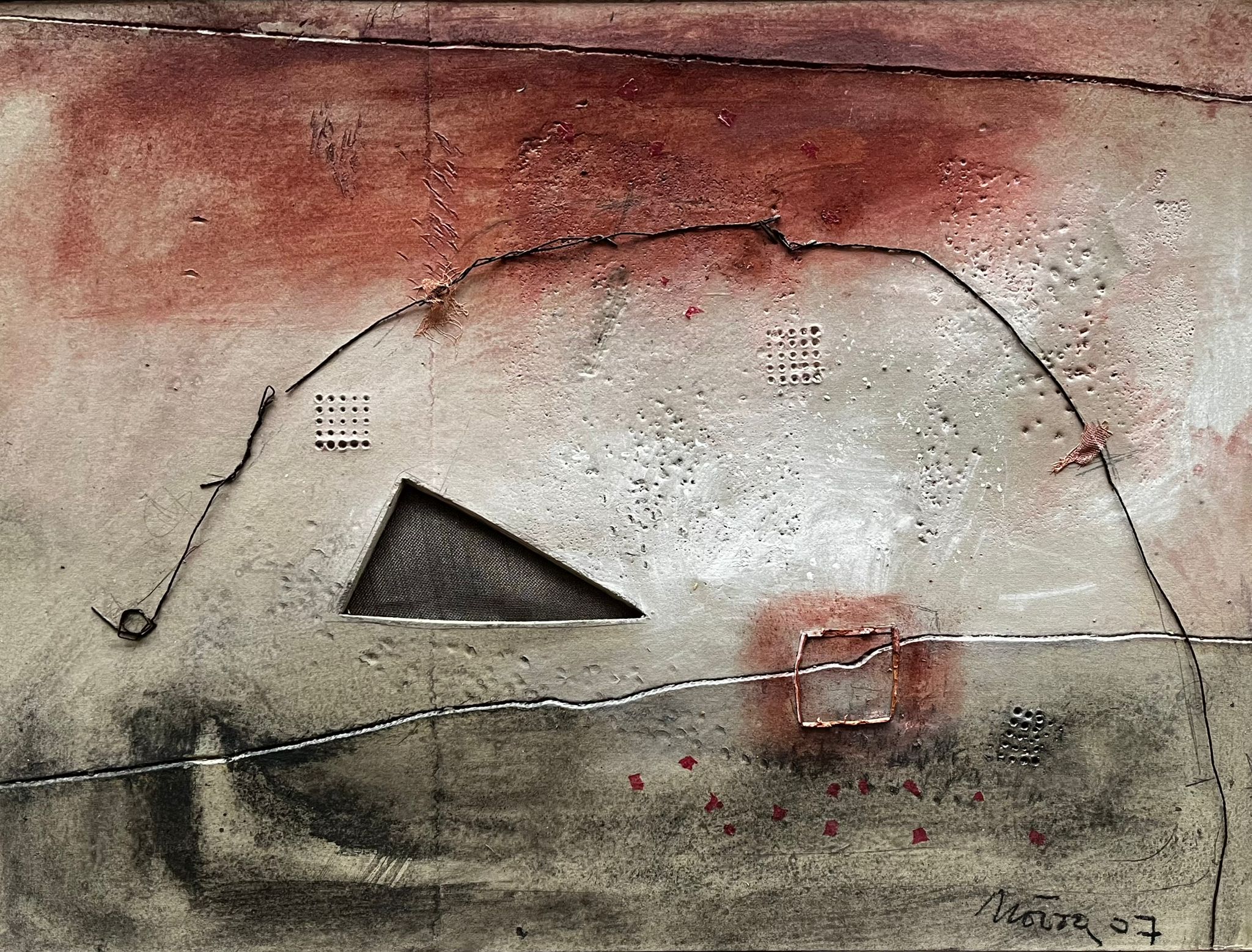 La muestra reúne una serie de piezas en las que Nóvoa — lejos de la monumentalidad de su obra mural o escultórica— nos revela un lado más íntimo del artista, donde el humilde soporte de cartón o papel, se convierte en un vehículo esencial de reflexión y trascendencia.